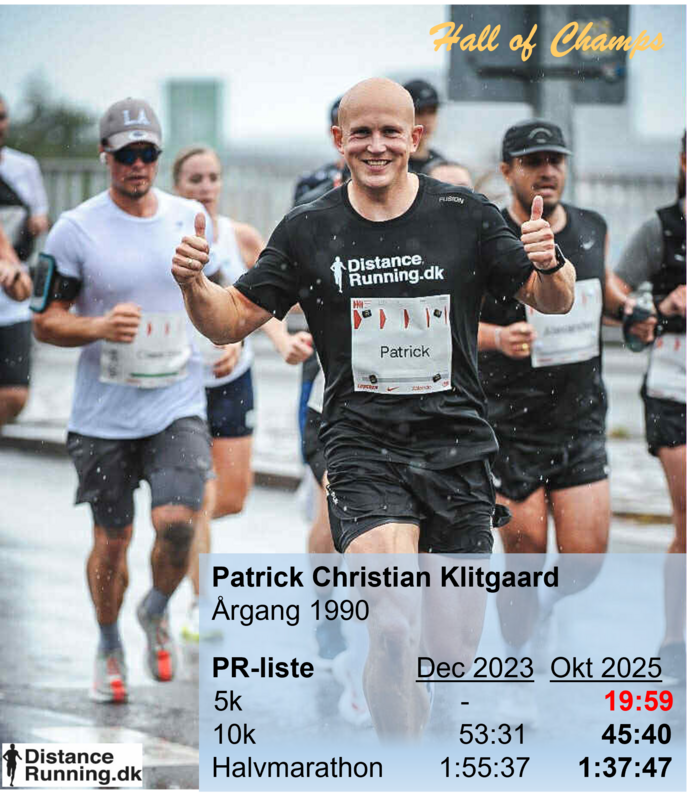 Oktober 2025: Patrick har lavet flotte forbedringer på både 10k (ca. 8 min) og halvmaraton (ca. 18 min.) og er senest kommet under de magiske 20 minutter på en 5k i tiden 19:59.