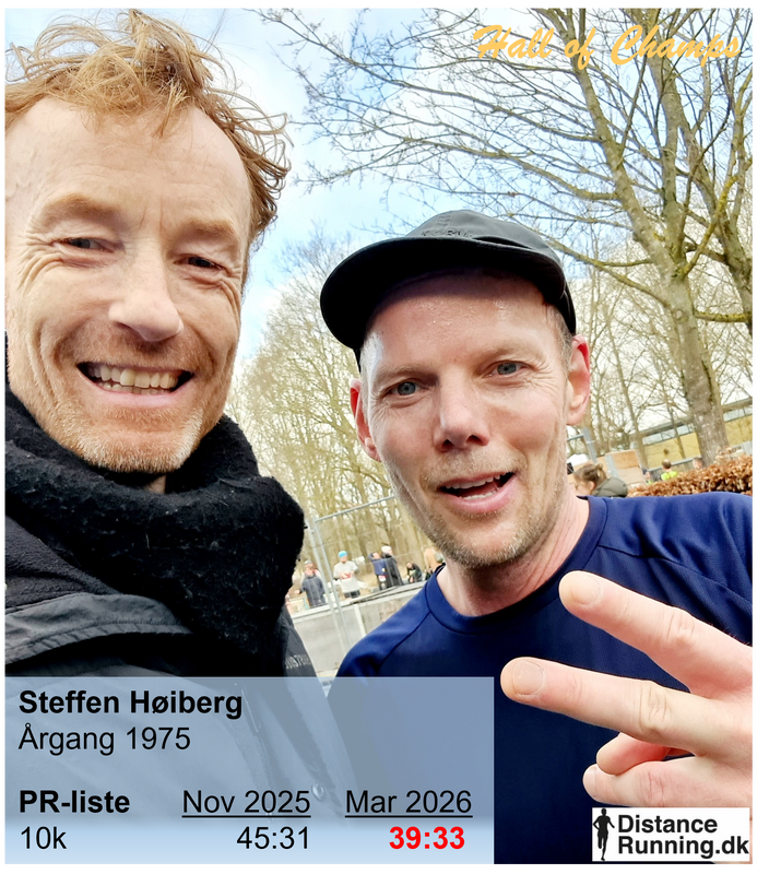 Marts 2026: Steffen er ny i Hall of Champs efter han har slået en 18 år gammel rekord på 10 km. i tiden 39:33. Steffen startede skræddersyet programforløb i november 2025, hvor hans seneste 10k tid var 45:31. Stærkt!