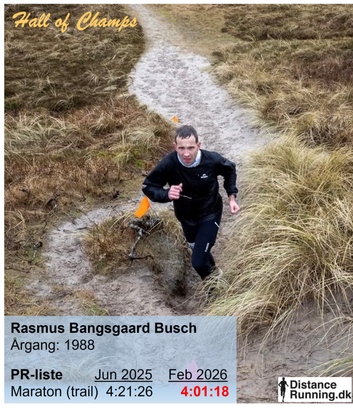 Februar 2026: Ny mand i Hall of Champs! Rasmus startede på Elite Runners Academy i juni 2025 og har rykket sig markant siden da. Rasmus gennemførte ThyTrail Marathon 2026 i tiden 4:01:18 – en forbedring på 20 minutter siden 2025 (4:21:26).